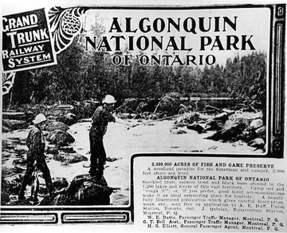 The highway to Algonquin Park was not constructed until 1936, so until that date, the railway was the only means — aside from the canoe — by which people could reach the park. Both the Grand Trunk Railway and later the Canadian National Railway (CNR) actively promoted travel to wilderness destinations within Canada. In the early twentieth century, the railway’s promotion of travel to wilderness destinations was extended to the building of hotels or lodges. In Algonquin Park, the CNR operated three lodges: the Highland Inn, Camp Minnesing, and Nominigan Lodge.