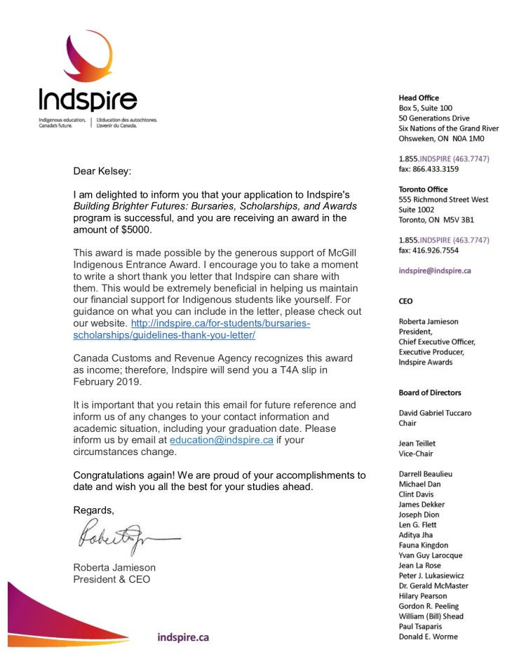 I’m just writing you to say thank you again for your letter of support. I wouldn’t have received Indspire’s McGill Indigenous Entrance award contributing $5,000 to my master’s studies without your help. This award will alleviate the financial burden of graduate studies, as well as allow me to pursue future avenues of research–all which wouldn’t have been possible without your help!